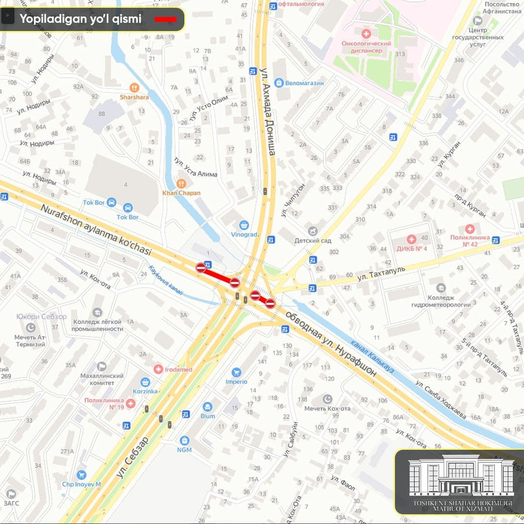 Тошкент шаҳар ҳокимлиги матбуот хизматининг маълум қилишича, йўл-таъмирлаш ишлари олиб борилаётгани сабабли 15 ноябрдан 25 ноябргача Себзор ва Нурафшон кўчаси кесишмасидан Нурафшон кўчаси бўйлав йўлнинг бир томони қисман ёпилади. Автотранспорт воситаларинининг ҳаракатланиши учун қарама-қарши йўл очиқ бўлади.