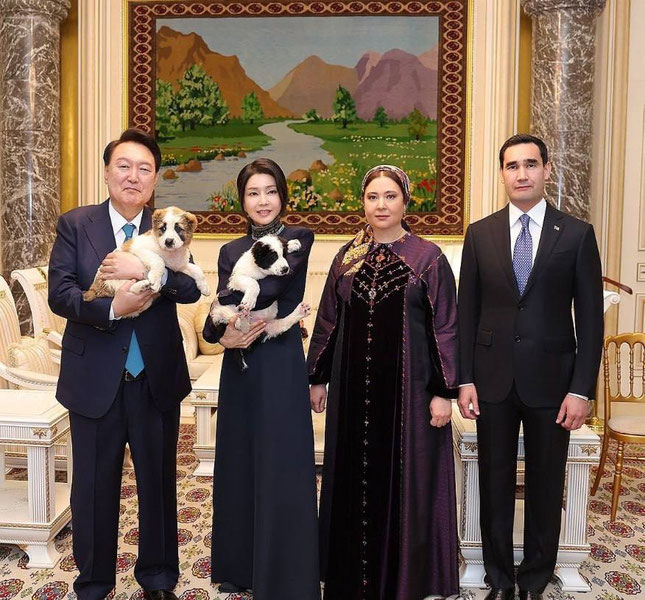 Сердар Бердимуҳаммедов айни пайтда Туркманистонда бўлиб турган Жанубий Корея Президенти Юн Сок Ёль ва унинг рафиқасига алабай итларини совға қилган. Шундан сўнг президентлар ва уларнинг рафиқалари биргаликда суратга тушишган.